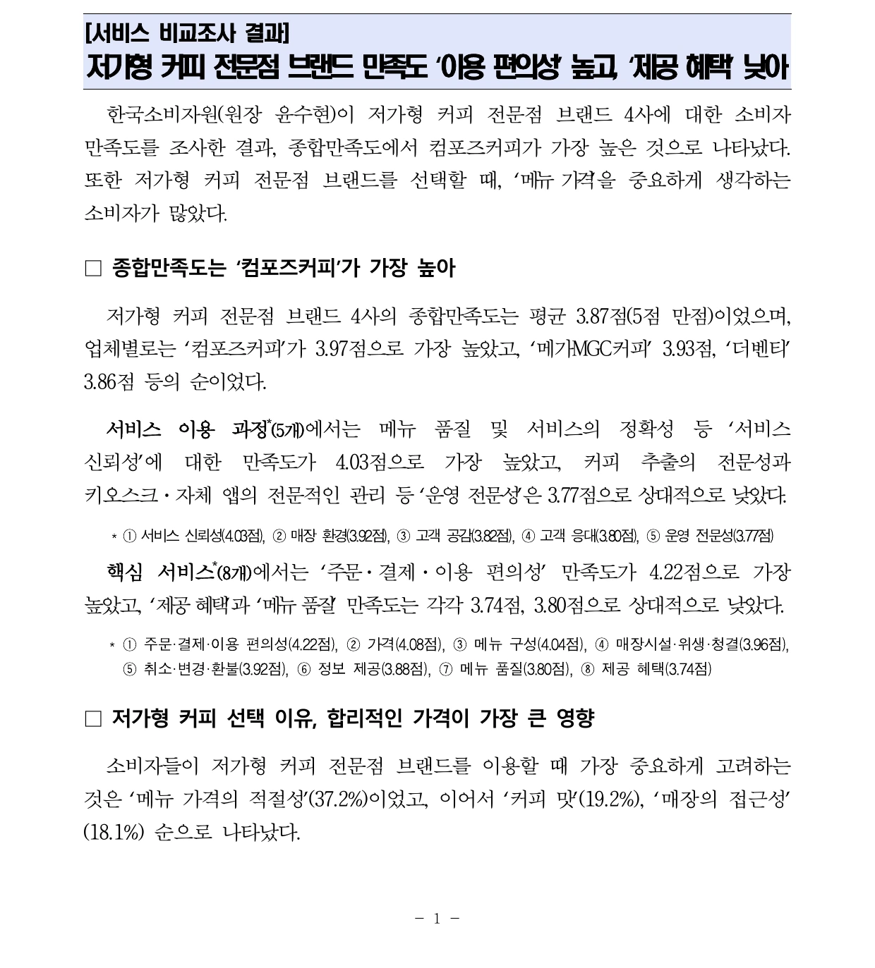 - 한국소비자원 보도자료 상세: 저가형 커피 전문점 브랜드 만족도 조사