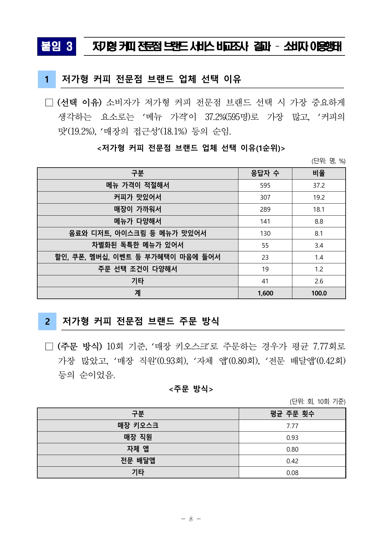 그렇게 단정하기는 어렵습니다. 가격은 가장 중요한 선택 이유였지만, 실제 불만은 커피 맛, 메뉴 품절, 주문 오류에서 많이 나왔습니다. 자주 이용할 브랜드를 고를 때는 가격과 함께 접근성, 주문 편의성, 맛의 일관성을 같이 보는 편이 낫습니다.