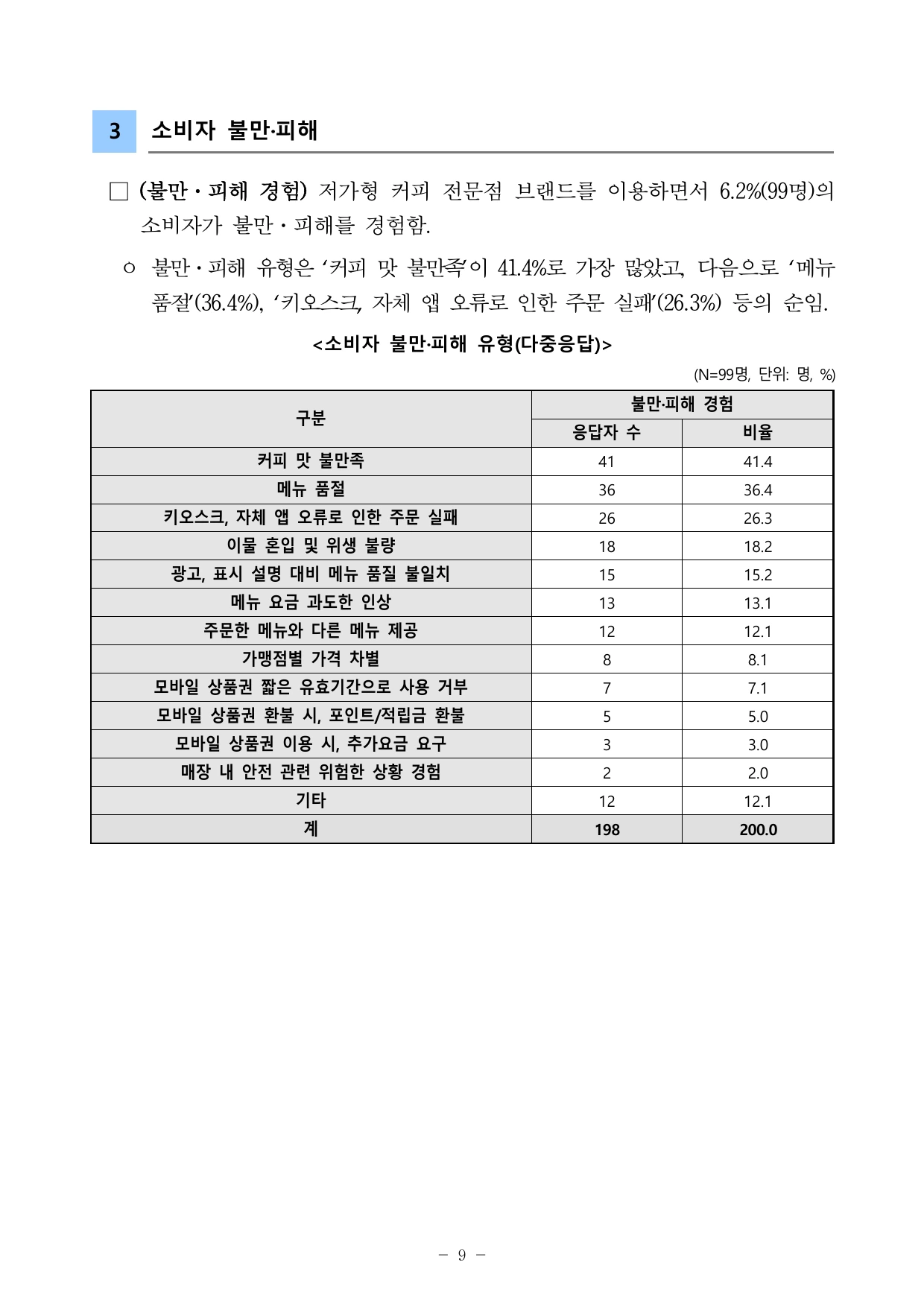 | 주요 불만 유형 | 커피 맛 불만족 41.4%, 메뉴 품절 36.4%, 키오스크·앱 주문 실패 26.3% |