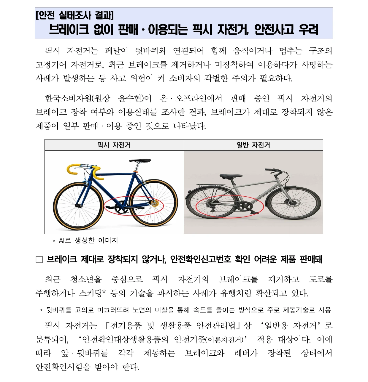 - 한국소비자원 공식 보도자료: 브레이크 없이 판매·이용되는 픽시 자전거, 안전사고 우려