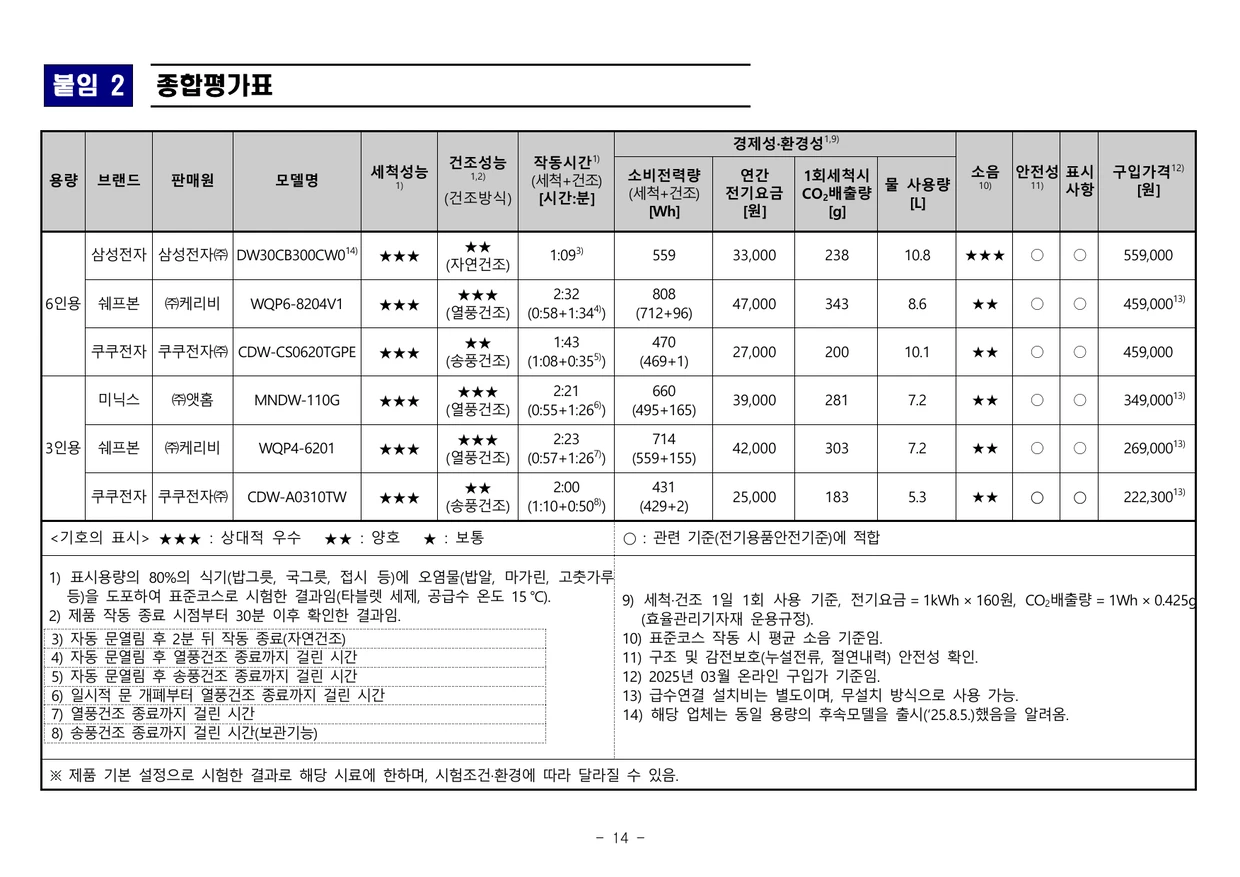 | 용량 | 브랜드/모델 | 가격(원) | 건조방식 | 세척성능 | 건조성능 | 작동시간(세척+건조) | 소비전력(Wh) | 연간전기요금(원) | CO2(g/1회) | 물 사용량(L/1회) | 무설치 |