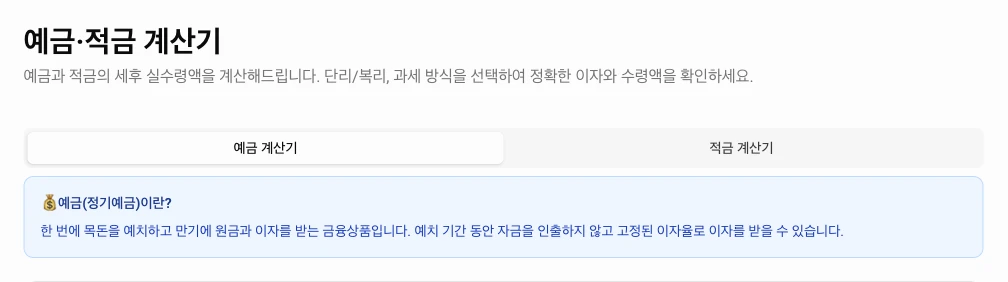 예금 계산기는 한 번에 맡기는 금액을 기준으로 계산합니다.적금 계산기는 매달 넣는 금액이 누적되면서 이자가 붙는 구조를 계산합니다.- 두 탭 모두