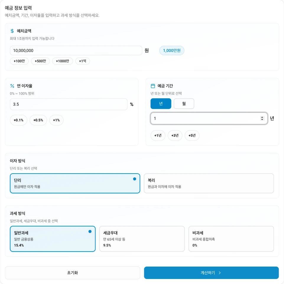 예치금액에 맡길 금액을 입력합니다.연 이자율에 상품 금리를 넣습니다.예금 기간에서년또는월을 고르고 기간을 입력합니다.이자 방식은 상품 설명에 맞게단리또는복리를 고릅니다.과세 방식은 일반과세가 기본이고, 조건이 맞으면 세금우대나 비과세를 선택합니다.