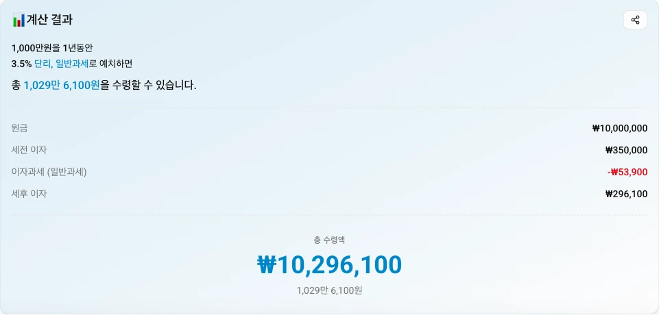 이 글의 예시는 1,000만원, 연 3.5%, 1년, 단리, 일반과세입니다.
