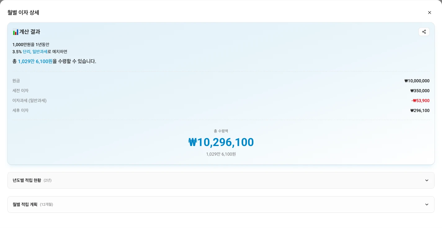 기본 비교용으로는 충분히 도움이 됩니다. 다만 실제 금융기관 상품에는 우대금리, 가입 조건, 중도해지 이율, 세부 계산 방식이 더 붙을 수 있으니 최종 판단 전에는 상품 설명서나 금융기관 안내를 꼭 함께 확인하세요.