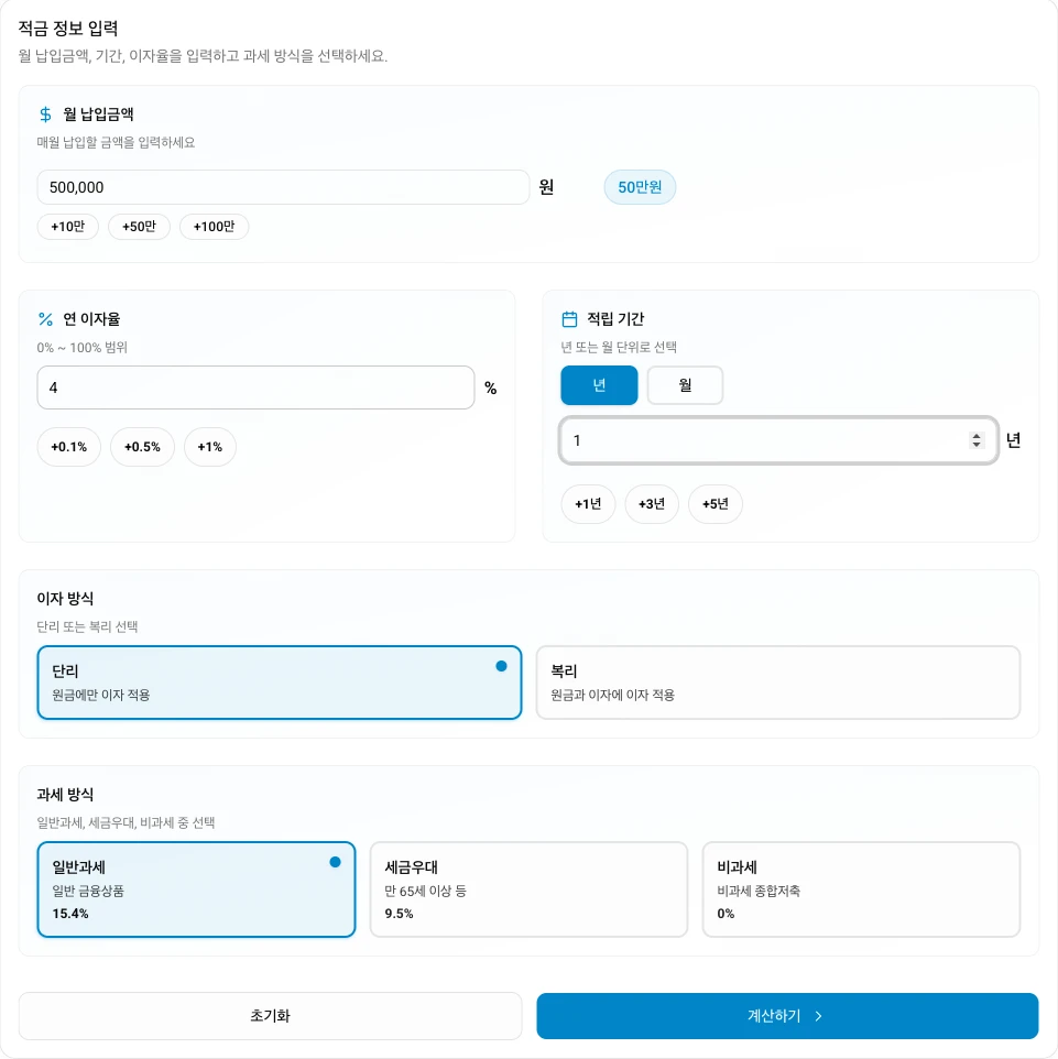 | 적금 계산기 | 매달 일정 금액을 납입할 때 | 월 50만원, 연 4.0%, 1년 |